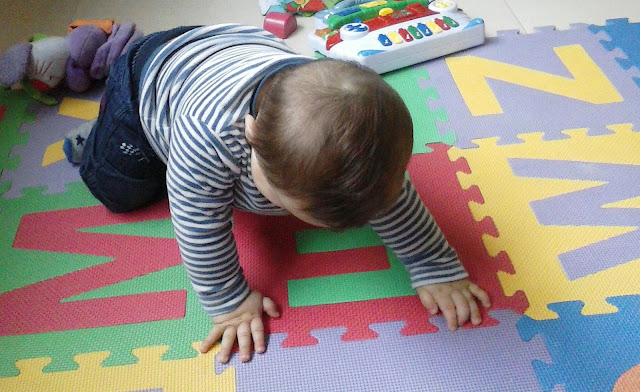 Moviment: No para quiet. Canviar-lo de roba és un turment, perquè no para de moure els peus i els braços. I tot i que encara no gateja de la manera ortodoxa sí que es mou per tot arreu arrosegant-se endarrere com un cranc. Ja no puc marxar tranquil.la si el deixo un moment al menjador per anar a fer qualsevol cosa, he d'estar pendent o endur-me'l perquè si no me'l puc trobar a l'altra punta de la sala.