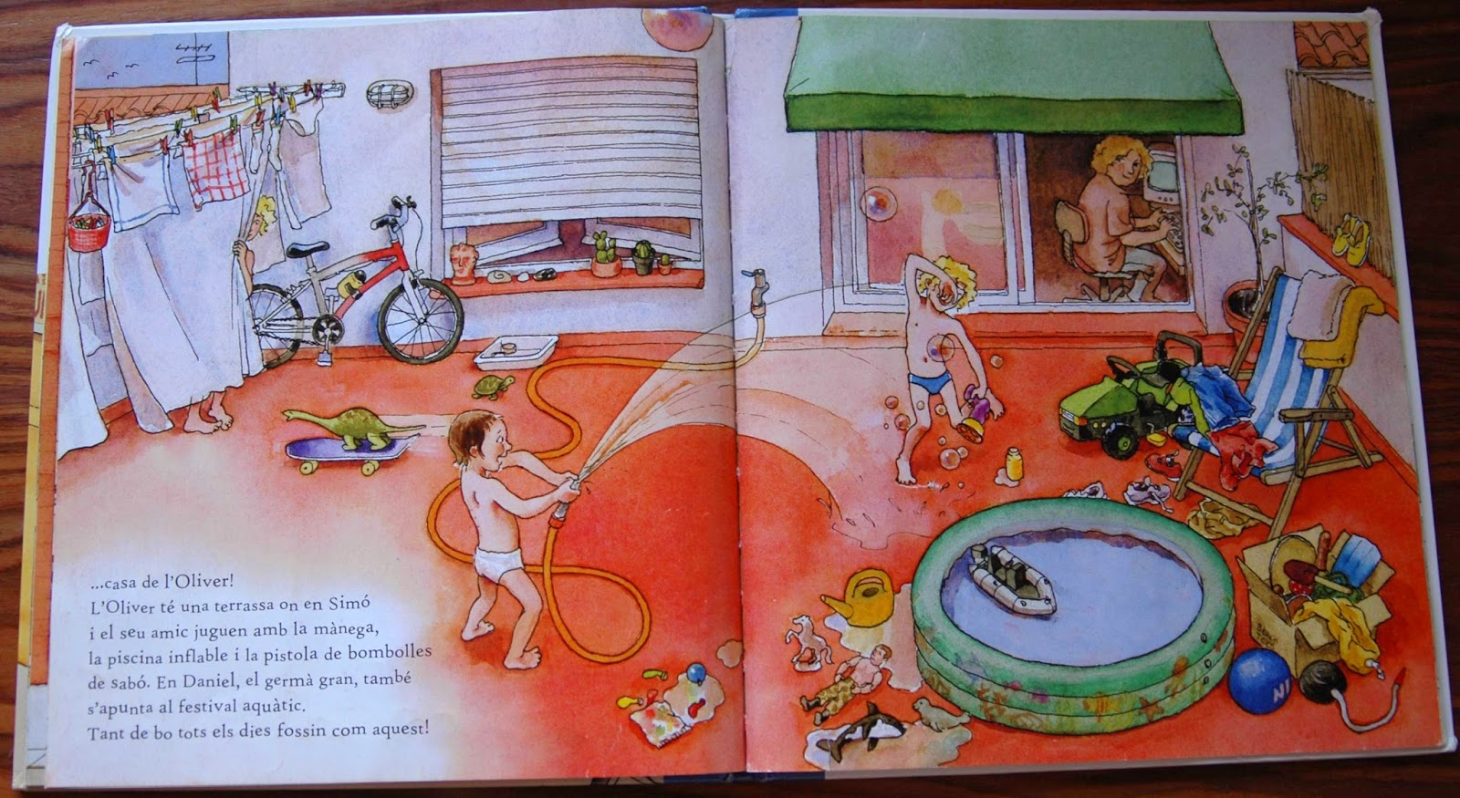 El Simó és fill de pares separats, i passa estones amb cada un d'ells. L'acompanya sempre un dinosaure de peluix de color verd, que és entretingut de buscar en totes les pàgines, no és fàcil! A la primera fotografia està sobre la falda de la seva mare. A les altres dues, podeu buscar-lo vosaltres, ;)!